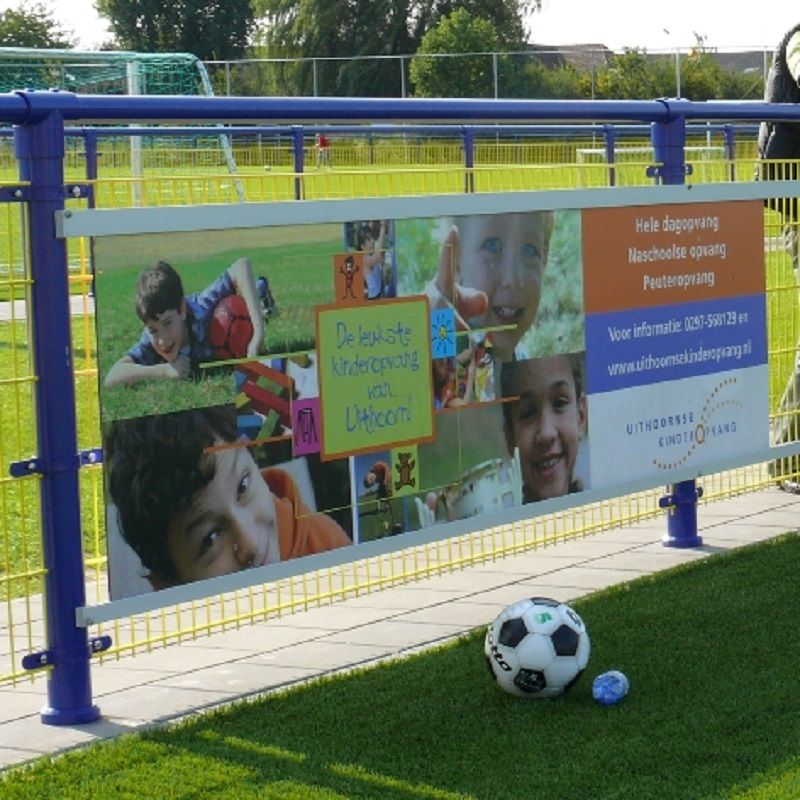 Reclamebord ophangsysteem bestaande uit twee geanodiseerde aluminium profielen waarmee reclameborden langs sport en/of evenementen terreinen kunnen worden opgehangen.