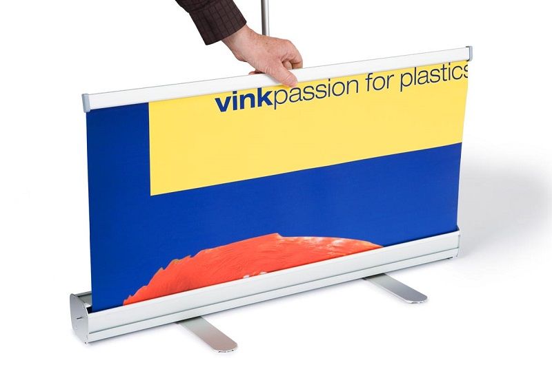Geanodiseerd vrijstaande banner displaysysteem waarbij de graphic onderaan in de cassette wordt opgerold. De graphic wordt aan de roll-up display banner vastgekleefd met behulp van een dubbelzijde tape. Het geheel is licht in gewicht (3,10 kg) en zeer gebruiksvriendelijk. De roll-up banner wordt geleverd in een zwarte neutrale draagtas.