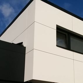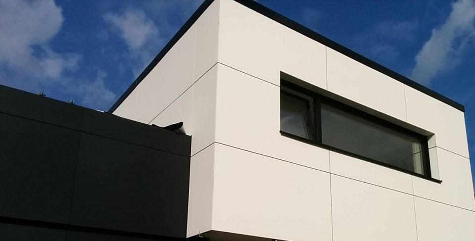 De Steni® gevelplaten geven de woning karakter en zorgen voor een strakke en cleane uitstraling. Steni® levert naast platen ook hoeken die gebruikt kunnen worden aan ramen en deuren. Het voordeel van dit systeem is dat de bevestiging van smalle stukken supereenvoudig wordt. En ook de mogelijkheid om de zijkanten van de plaat mee in te kleuren waardoor de volledige montage uit één en dezelfde kleur bestaat, draagt bij tot een strak eindresultaat.
