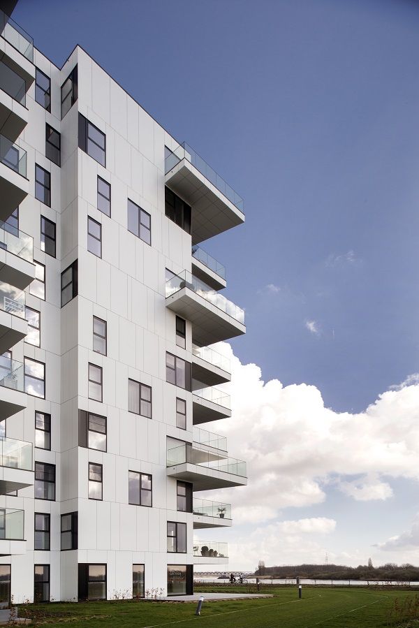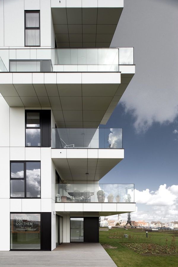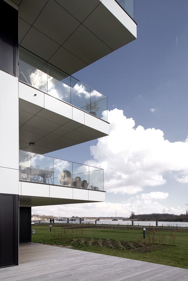 Dit moderne appartementencomplex ligt aan de Schelde oever In Temse . Het gebouw is bekleed met STENI Colour gevelplaten. Het werd ontworpen door Conix RDBM Architects.