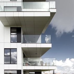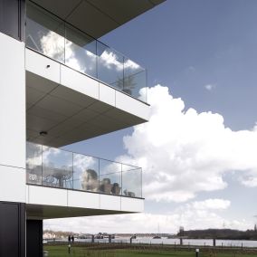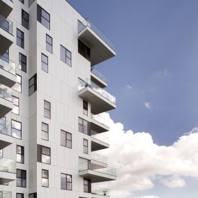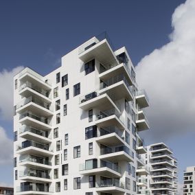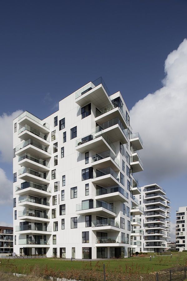 Witte STENI gevelplaten van verschillende afmetingen en beglaasde balkons zorgen voor een unieke uitstraling en een bijzonder uitnodigende woonomgeving.