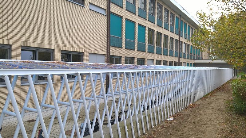 Aangezien de kleur van de platen in harmonie moest zijn met de omgeving, de school en de aangrenzende appartementen, werd voor dit project een zeer speciale kleur vervaardigd. De binnenste 5 wanden zijn licht opaal, de kleur van buitenwanden werd verkregen door een coëxtrusie blauw op de ArcoPlus® 9207 platen.