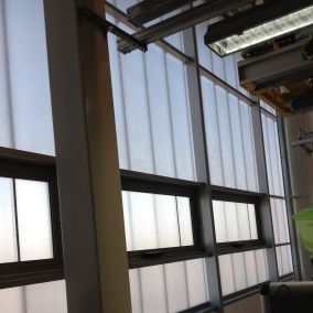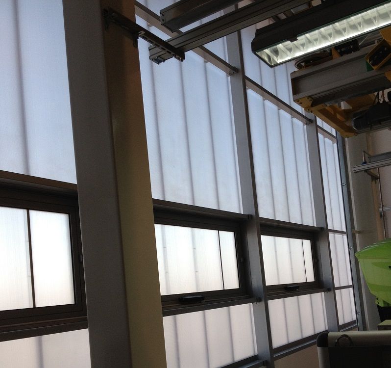 De translucente hoekwand werd uitgevoerd met opaalkleurige Arcotherm platen. Arcotherm is een modulair systeem uit UV -beschermd gecoëxtrudeerd meerwandig polycarbonaat, ideaal voor de realisatie van continue gevels met verhoogde isolatiewaarden.