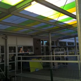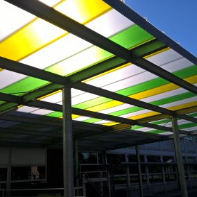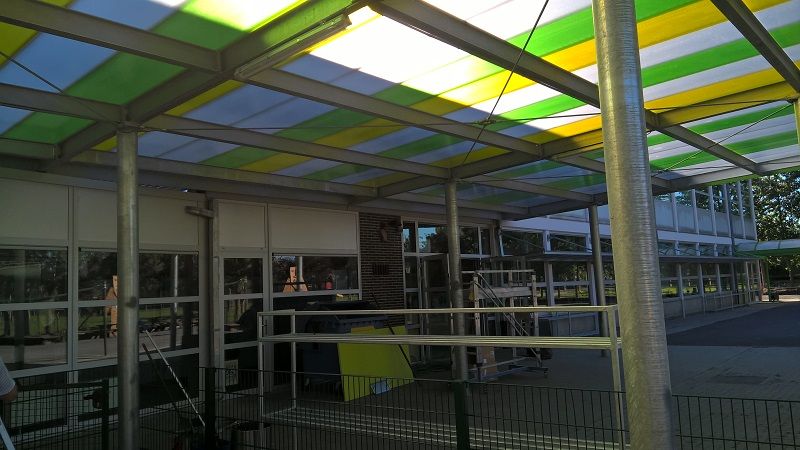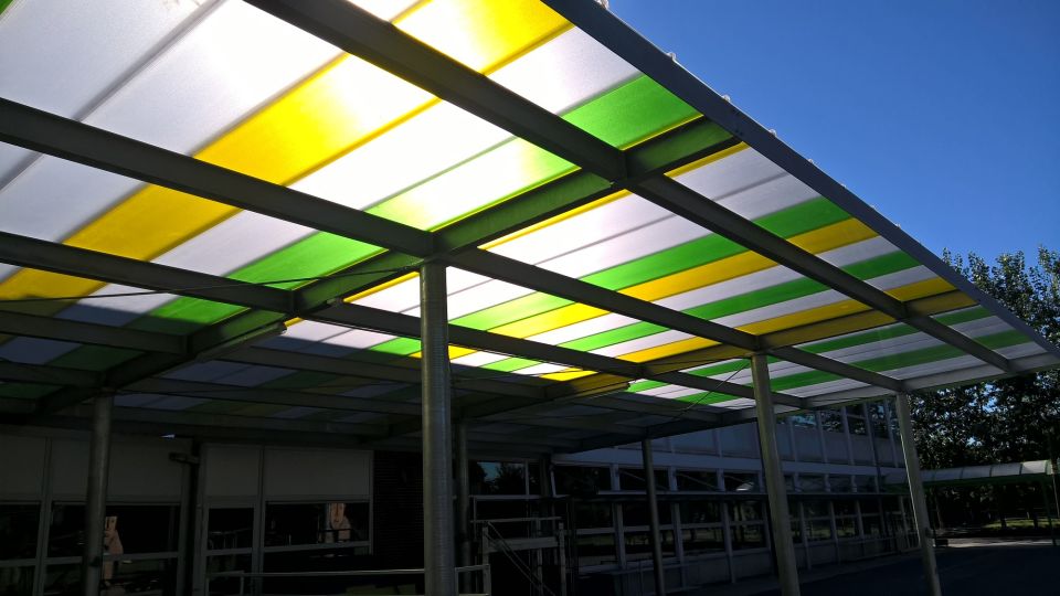 Op de speelplaats van de vrije basisschool Eeckberger in Sint-Gillis-Waas en de St. Donatus school in Meise zorgt een luifel uit gekleurde en translucente ArcoPlus 626 panelen dan weer voor speelse kleureffecten.